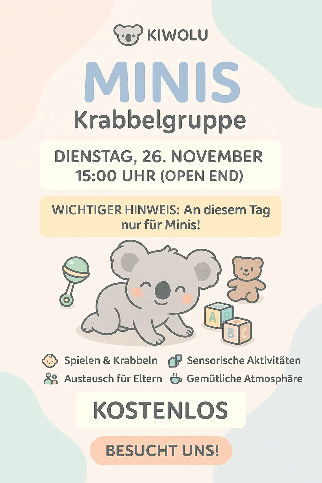👶🧸 MINIS - KRABBELGRUPPE 🧸👶 Ein besonderer Tag nur für unsere Kleinsten! 💕 📅 Dienstag, 26. November 🕒 15:00 Uhr (open end) 📍 kiwolu by Mimi's ⚠️ WICHTIGER HINWEIS: An diesem Tag ist kiwolu NUR für Minis (Krabbelkinder) geöffnet! So können sich die Kleinsten in Ruhe entfalten. 🐣 WAS EUCH ERWARTET: 🧩 Spielen & Krabbeln in sicherer Umgebung 🎨 Sensorische Aktivitäten 👨👩👧 Austausch für Eltern ☕ Gemütliche Atmosphäre 🤗 Neue Freundschaften knüpfen 💰 EINTRITT FREI - KOSTENLOS! 🎉 Kommt vorbei und lasst eure Minis die Welt entdecken! 🌈
